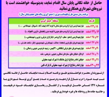 برنامه زمان بندی طرح استقبال از بهار (جمعآوری زباله های حجیم پایان سال)Nowshahr۱۵ اسفند ۱۴۰۳شهرداری نوشهر در نظر دارد جهت پاکیزگی محیط زیست و رفاه حال شهروندان عزیز از تاریخ «۱۵ اسفند الی ۳۰ ... ادامه مطلب